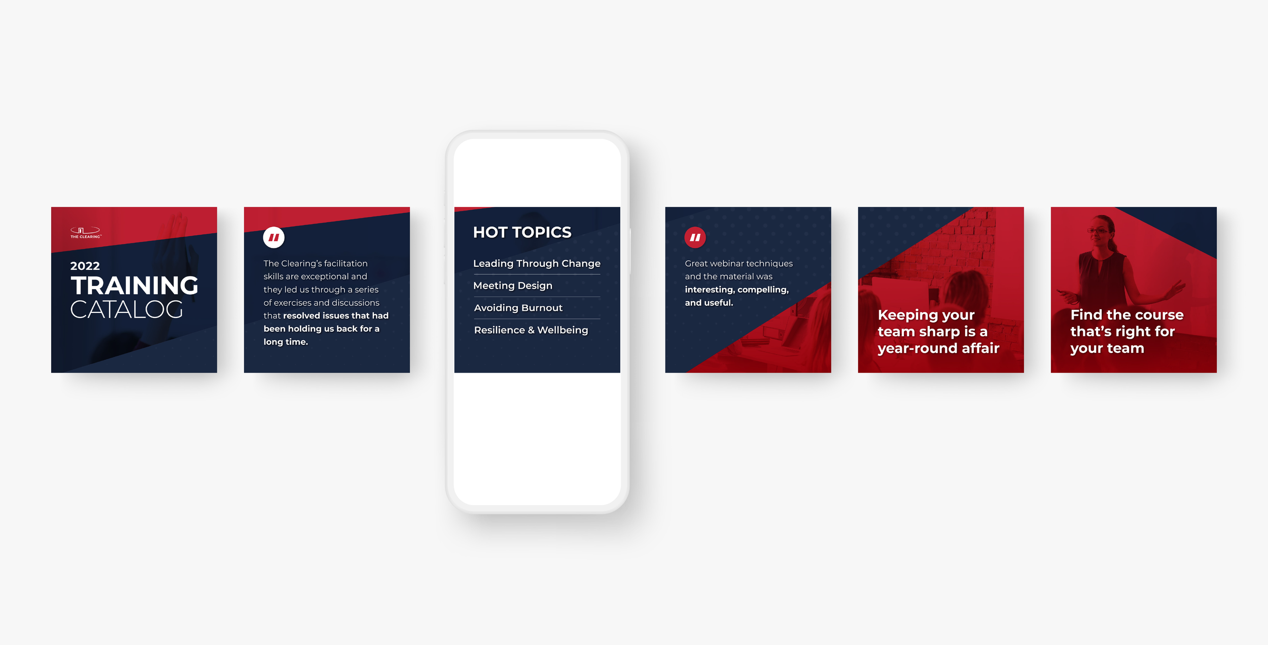 This dynamic carousel ad transforms an extensive training catalog into a concise, compelling narrative that guides potential clients through the company’s service offerings. Bold color blocking in navy and red creates visual impact while maintaining brand cohesion. The design translates the established content flow into an engaging, mobile-optimized format that effectively showcases the services.